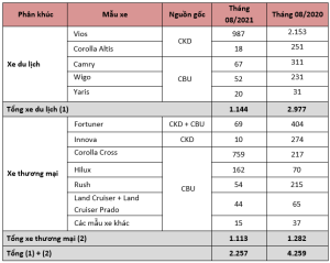 Trong tháng 08/2021, Toyota đạt 2.304 xe (bao gồm xe Lexus), giảm 47% so với cùng kỳ năm trước trong khi tổng thị trường giảm 54% (tháng 08/2020)