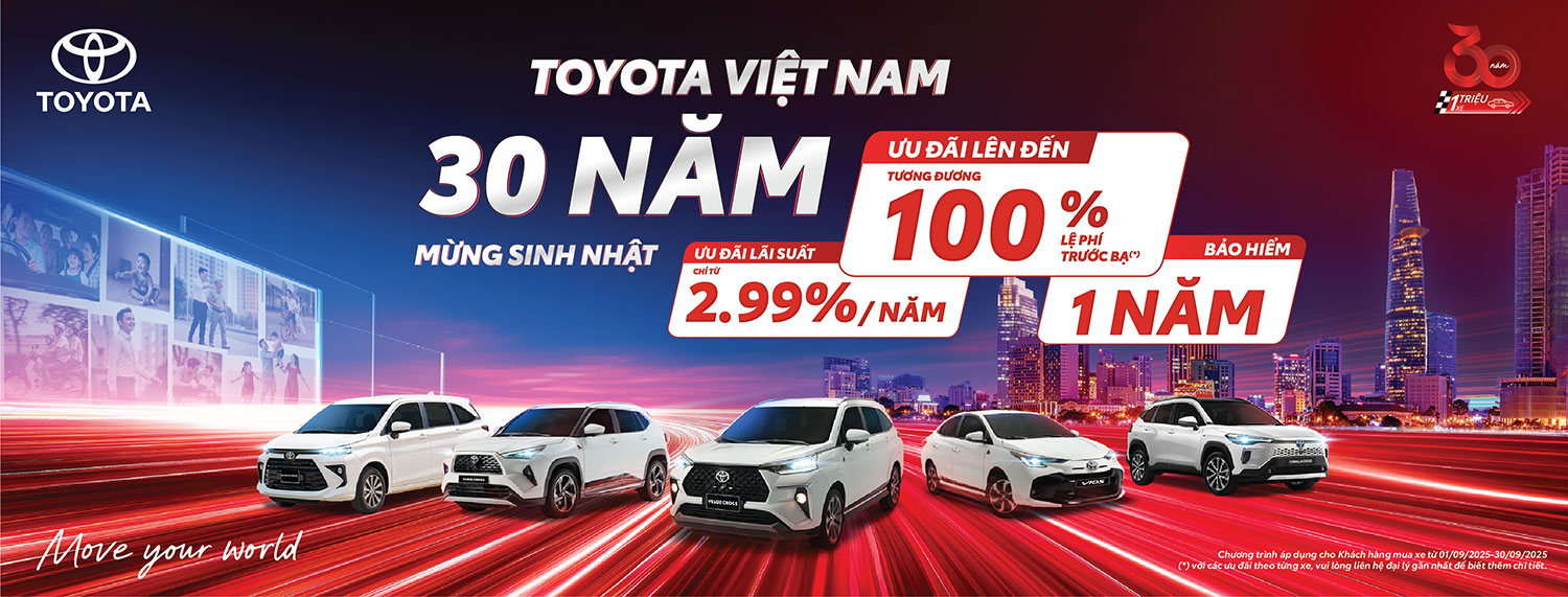 Để kỷ niệm dấu mốc đặc biệt mừng sinh nhật 30 năm, Toyota Việt Nam ra mắt 3 phiên bản đặc biệt cho các dòng xe: Vios, Yaris Cross, Veloz. Toyota Hoài Đức trân trọng kính mời quý Khách hàng đến tham dự sự kiện: RA MẮT PHIÊN BẢN ĐẶC BIỆT VÀ MỪNG SINH NHẬT 30 NĂM CỦA TOYOTA VIỆT NAM: