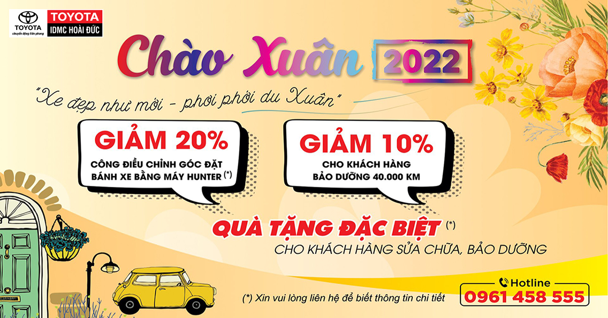 Nhân dịp đầu xuân Nhâm Dần, Toyota Hoài Đức xin gửi đến chương trình ưu đãi hấp dẫn khi KH cho xe vào đại lý sửa chữa/ bảo dưỡng với những hạng mục giảm giá hấp dẫn: