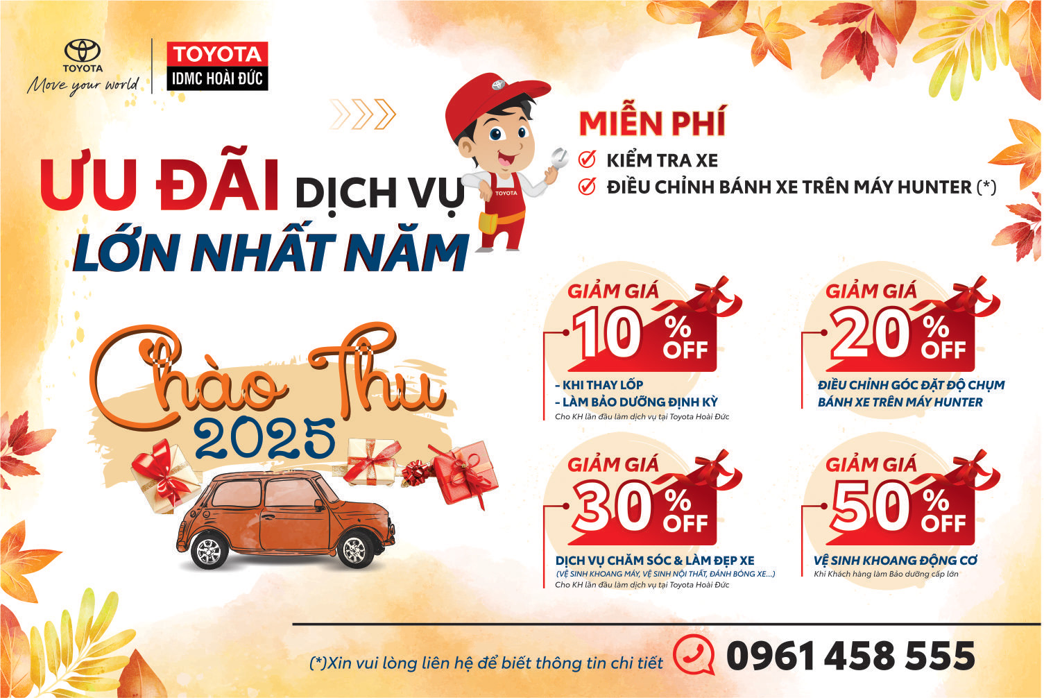 Bắt đầu ngày 18/08 Toyota Hoài Đức xin gửi đến tất cả quý khách hàng quan tâm dịch vụ sửa chữa/ bảo dưỡng ưu đãi vô cùng lớn. Chương trình sẽ bắt đầu từ ngày 18/08/2025 đến 20/09/2025 cho khách hàng sử dụng dịch vụ tại Toyota Hoài Đức bao gồm:
